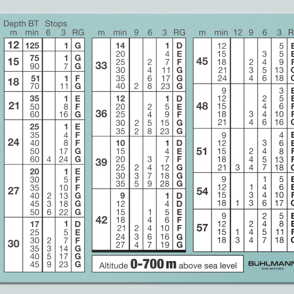 The turning Twin Safety Dial features ® the ZH-L16B Bühlmann decompression stops calculator. It allows to measure decompression stops for 17 recreational dive profiles.